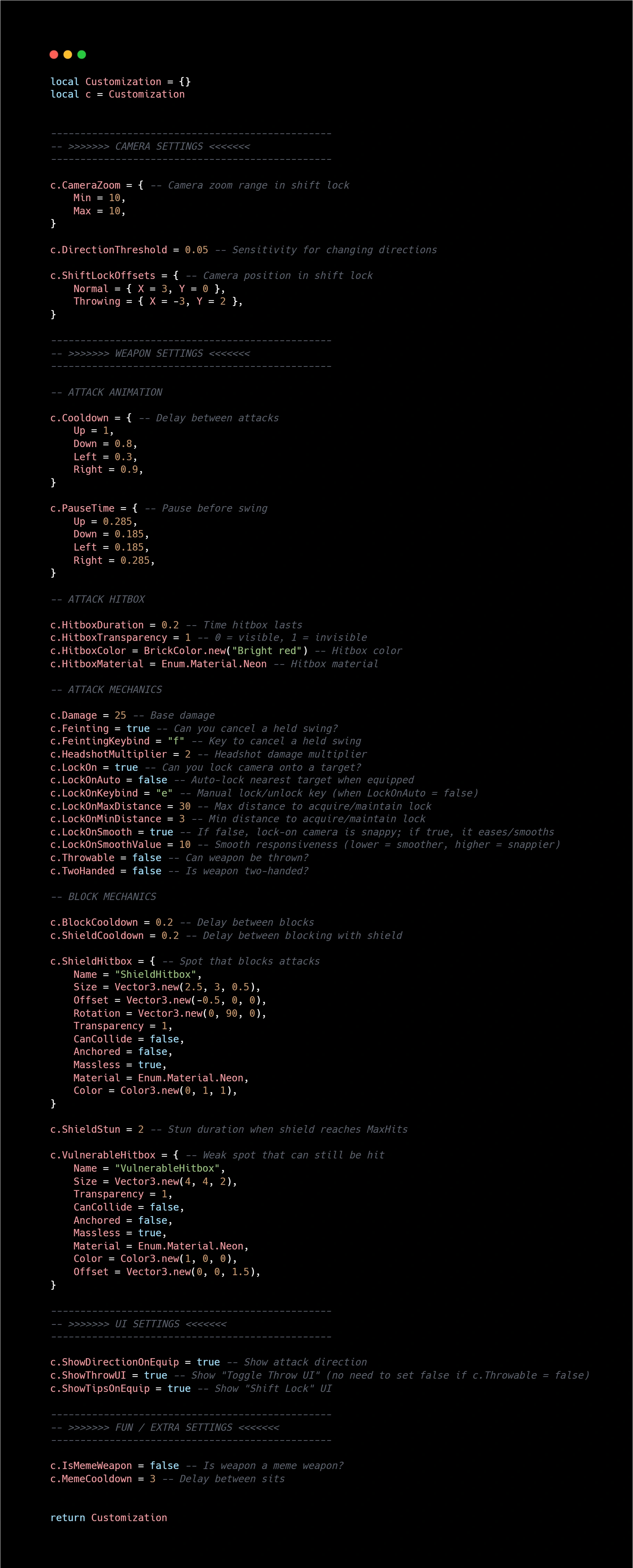 A customizable combat system with directional attacking, blocking, shielding, and throwing, as well as armor, inventory, and crafting support.