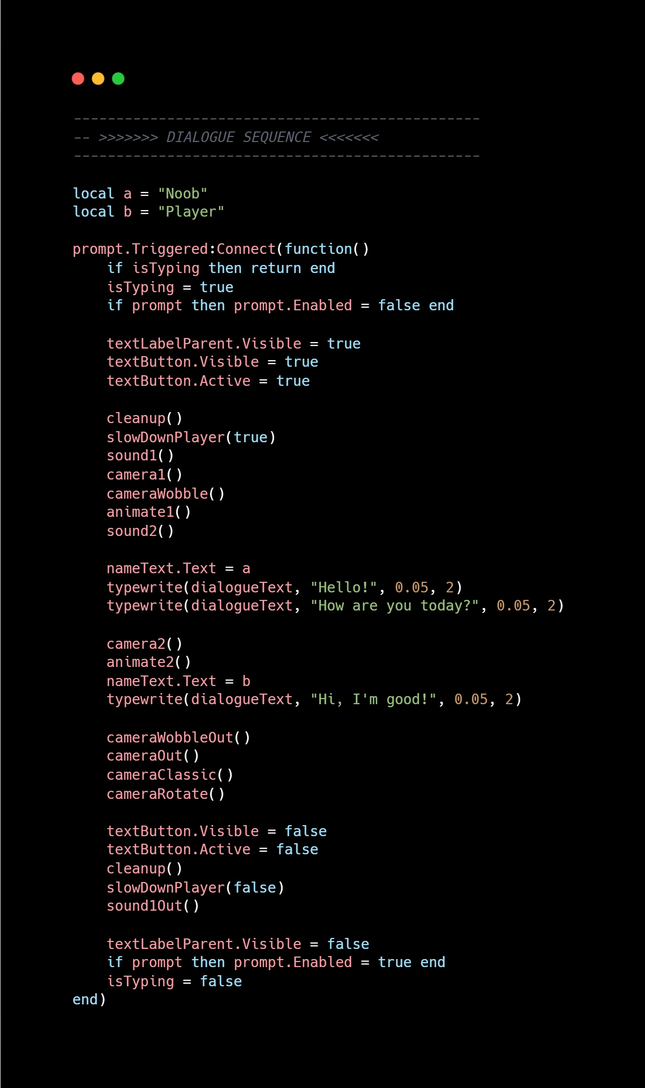 A dialogue system with cutscene effects, triggered by ProximityPrompt (holding E) or Touch (when a player touches a part or union).
